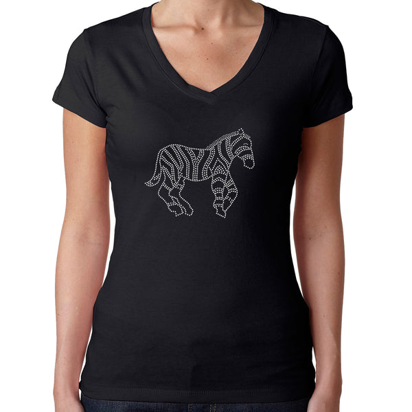 Womens T-Shirt Bling Black Fitted Tee Crystal Silver Zebra