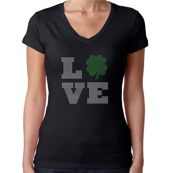 Womens T-Shirt Rhinestone Bling Black Fitted Tee LOVE Irish Shamrock St. Patrick
